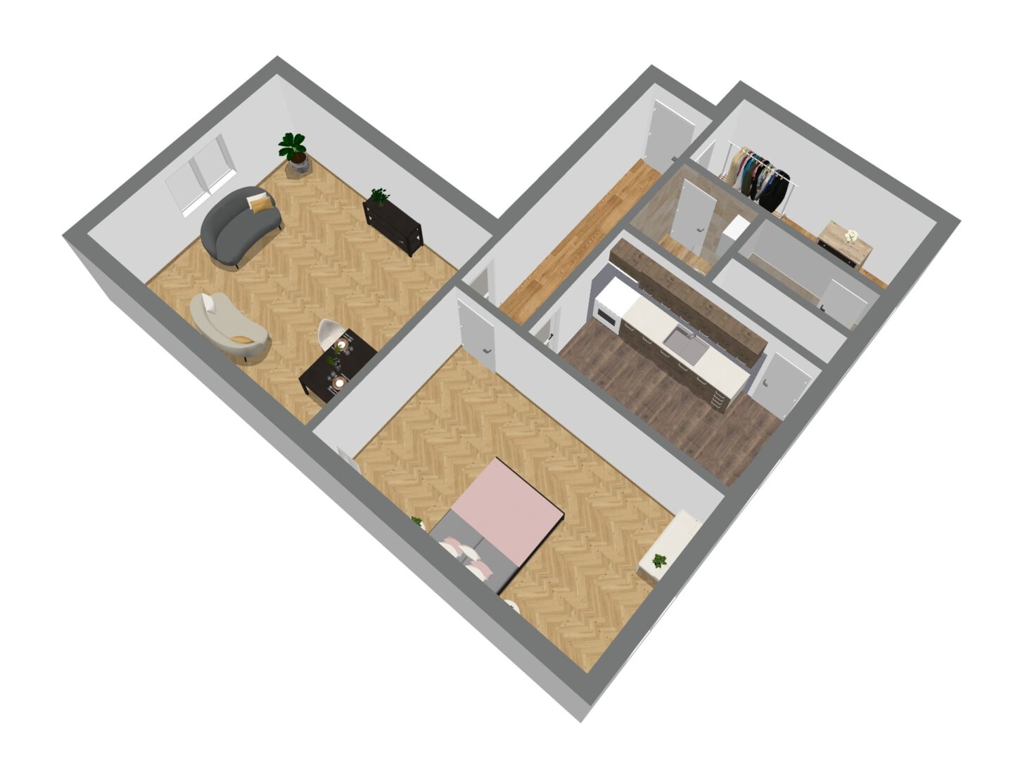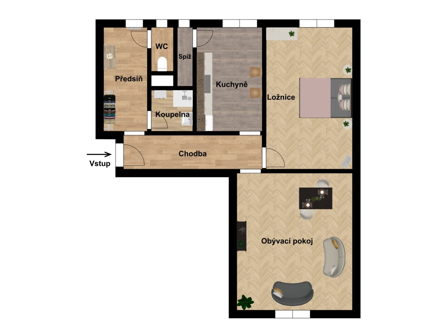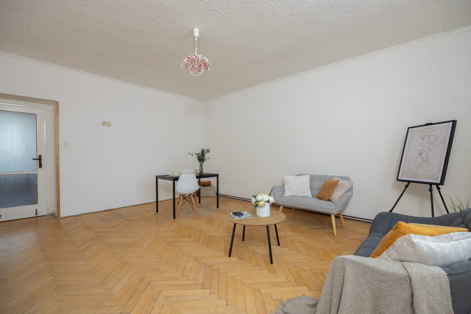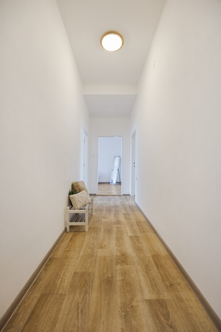 Podlahy v pokojích zdobí zachovalé parkety – jejich renovací můžete interiéru dodat moderní vzhled a styl. V ostatních částech bytu je na podlaze praktické lino. Součástí bytu je také prostorný sklep, ideální pro uskladnění věcí.
