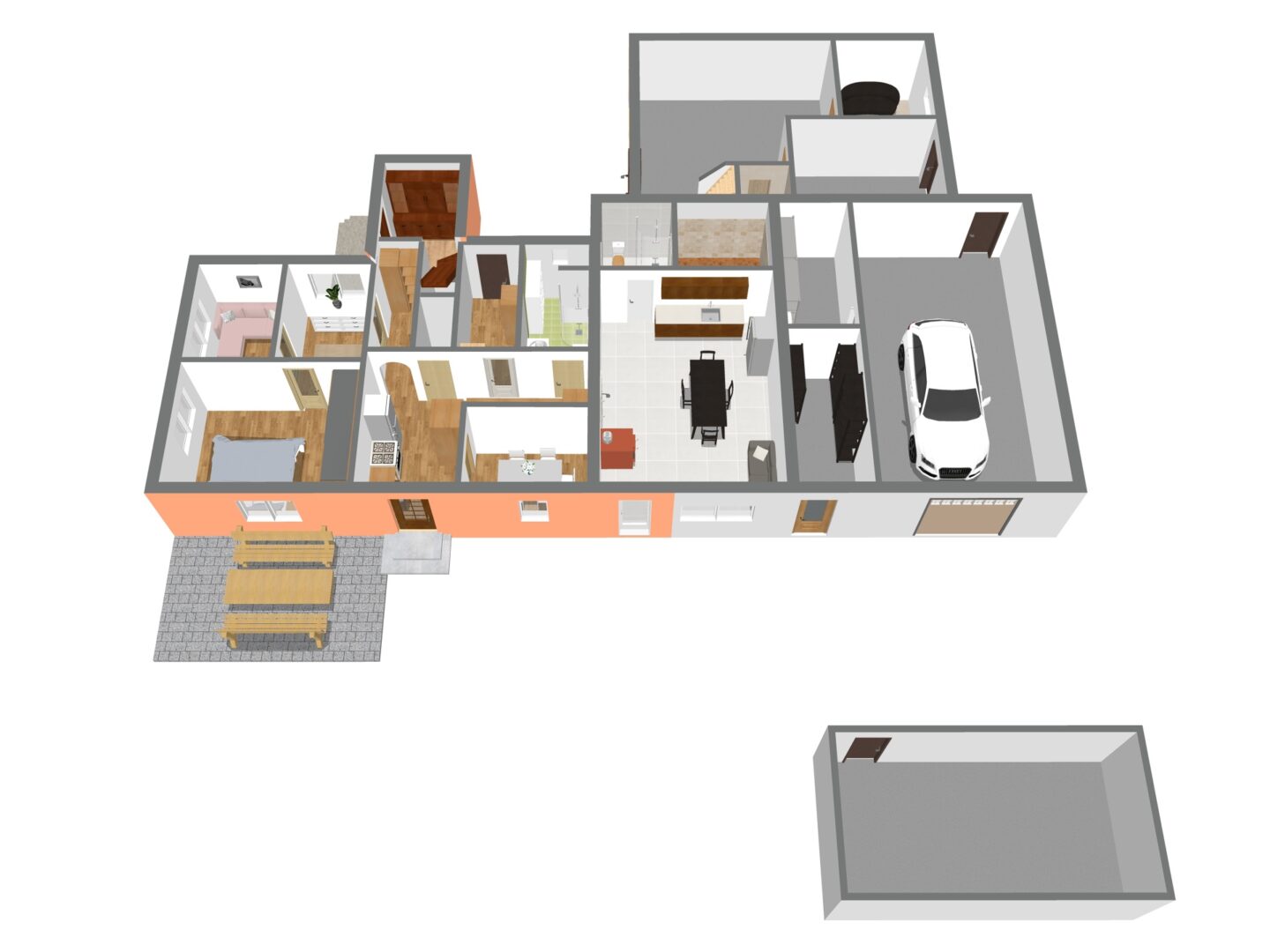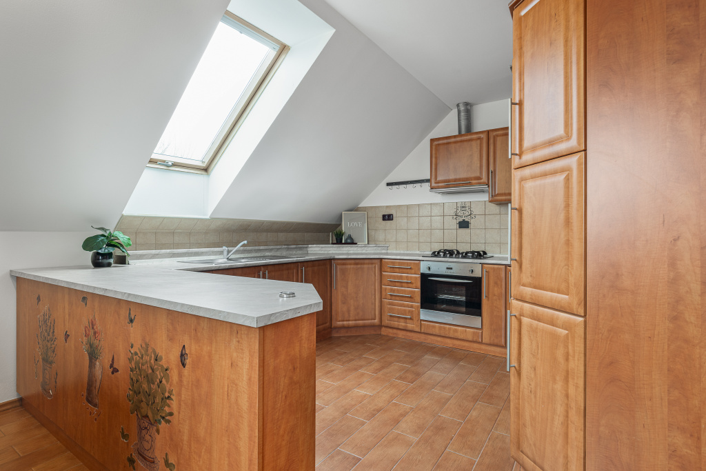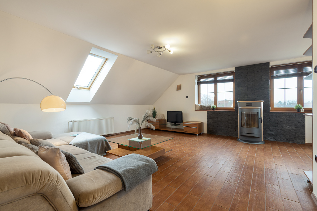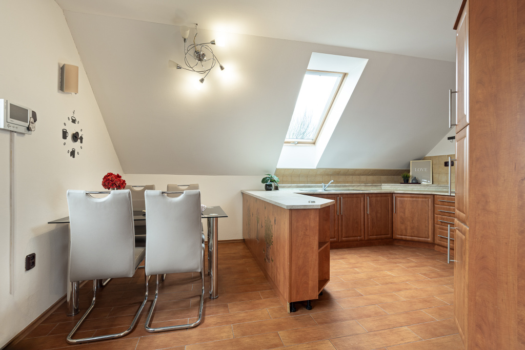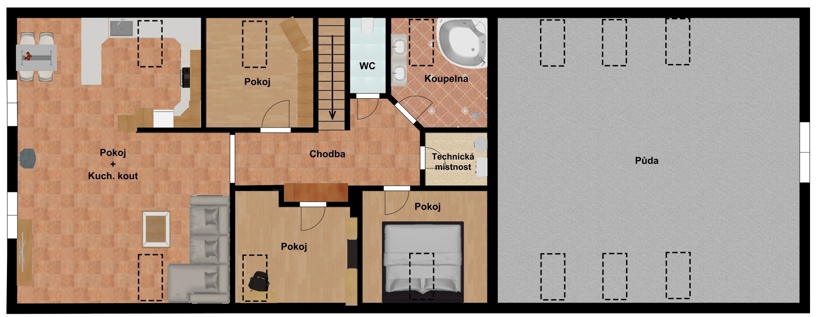 Byt v patře Vám nabízí velkoryse řešený otevřený prostor spojením obývacího pokoje s kuchyní. Kuchyně je vybavena plynovou varnou deskou, elektrickou troubou a lednicí s mrazákem. V jídelním koutě se nachází stůl se židlemi. Pokoje jsou neprůchozí se střešními okny Velux. Koupelna je zařízena masážní rohovou vanou, sprchovým koutem a 2 umyvadly. Úložné prostory nabízejí skříně u schodiště nebo v pokojích. Za horkých letních dnů určitě oceníte altánek s kuchyňkou a venkovní gril, kde si rádi posedíte s přáteli a dopřejete si kafíčko nebo grilovaný stejk.