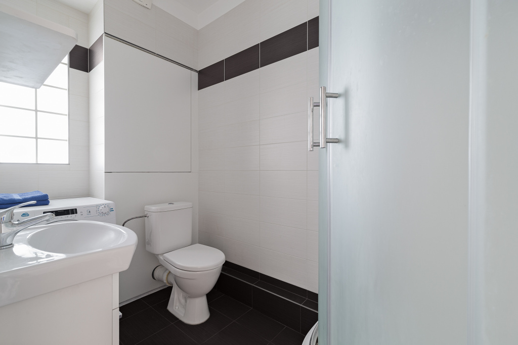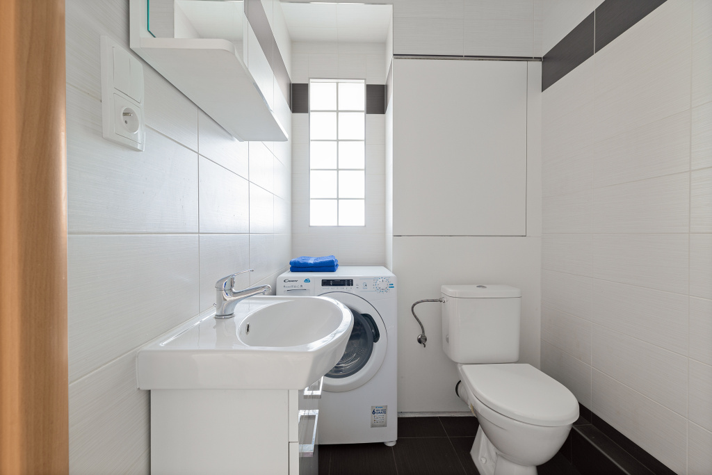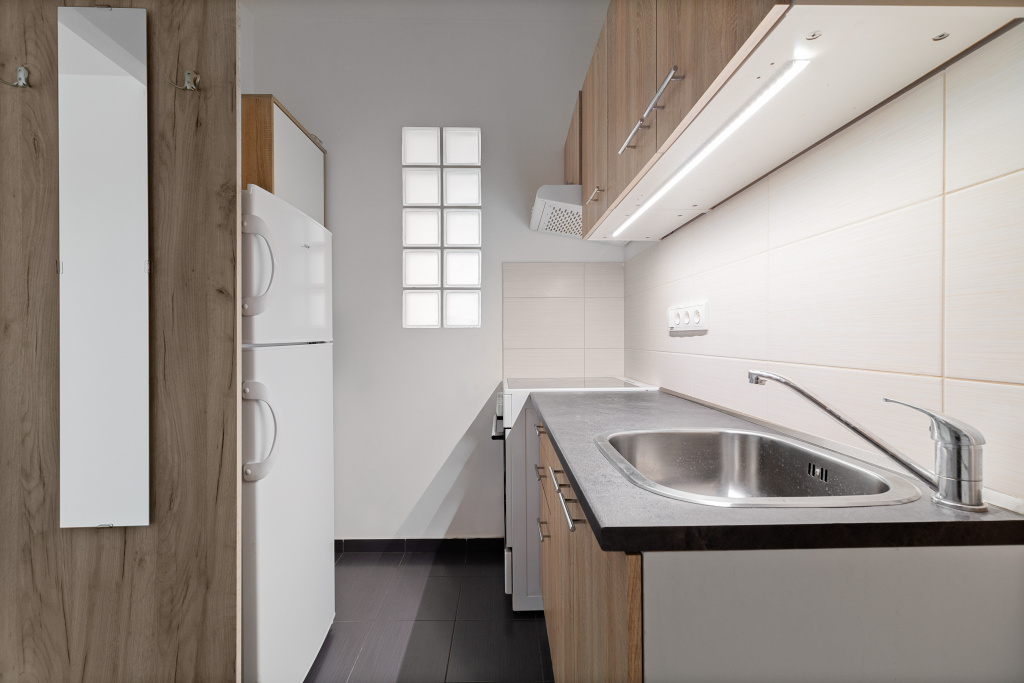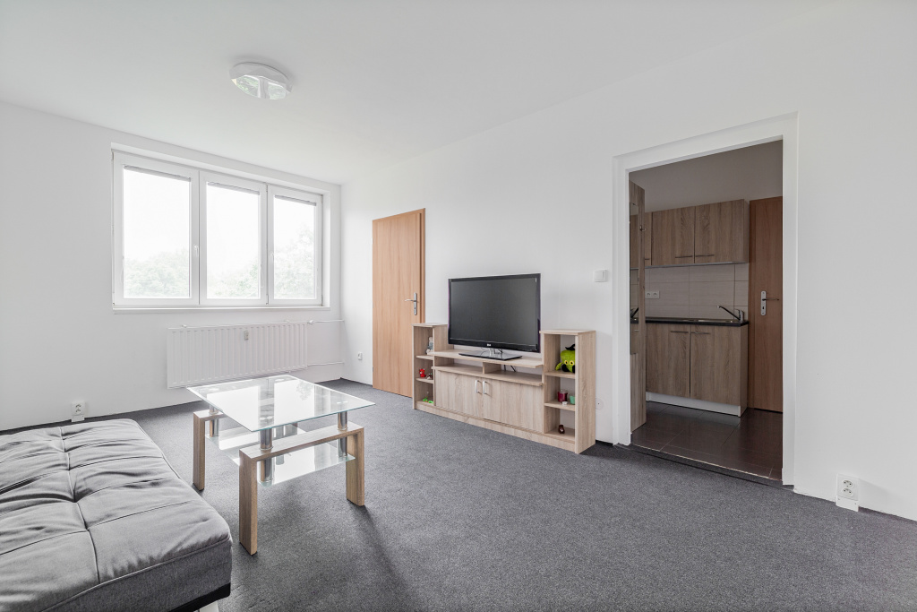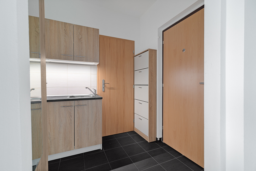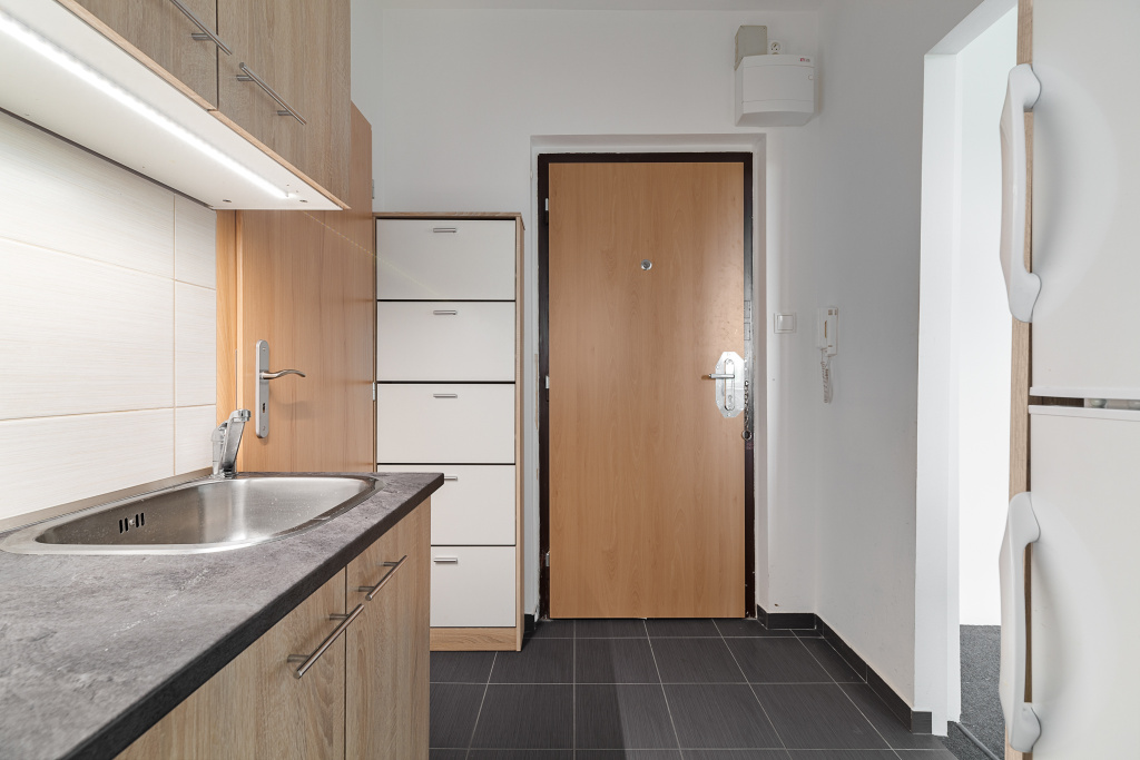 Díky umístění kuchyňské linky v chodbě získáváte plnohodnotný obývací pokoj a ložnici. Koupelna má sprchový kout a WC. Kuchyň je vybavená vším potřebným – nádobí, elektrický sporák s troubou i lednice s mrazákem. V ložnici je prostorná vestavěná skříň, kam se vejdou všechny vaše věci. V obýváku čeká televize se základním balíčkem programů. Pračka v koupelně a balkón v mezipatře vyřeší vaše praní.